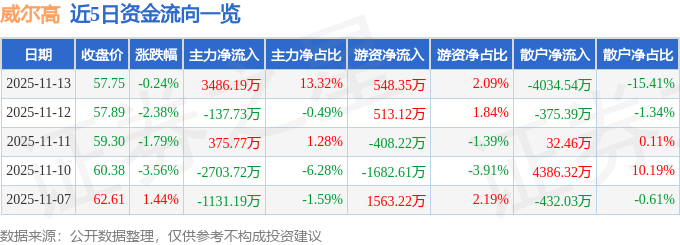 证券之星消息,截至2025年11月13日收盘,威尔高(301251)报收于57.75元,下跌0.24%,换手率8.33%,成交量4.49万手,成交额2.62亿元。