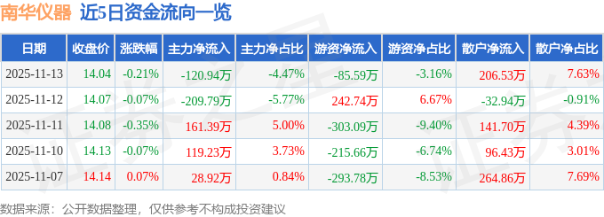 证券之星消息,截至2025年11月13日收盘,南华仪器(300417)报收于14.04元,下跌0.21%,换手率2.21%,成交量1.93万手,成交额2707.4万元。