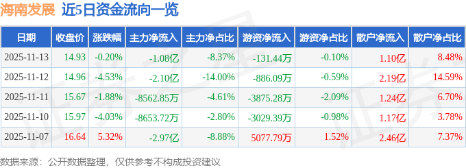 证券之星消息,截至2025年11月13日收盘,海南发展(002163)报收于14.93元,下跌0.2%,换手率10.71%,成交量86.06万手,成交额12.95亿元。