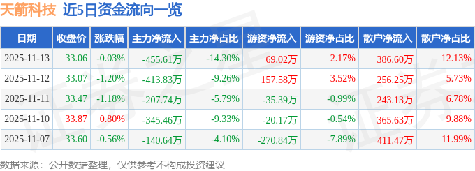 证券之星消息,截至2025年11月13日收盘,天箭科技(002977)报收于33.06元,下跌0.03%,换手率1.44%,成交量9619.0手,成交额3186.56万元。