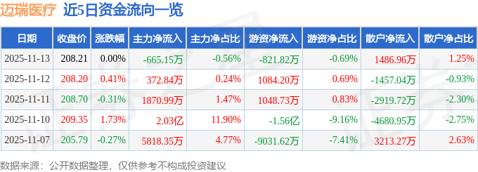 证券之星消息,截至2025年11月13日收盘,迈瑞医疗(300760)报收于208.21元,上涨0.0%,换手率0.47%,成交量5.71万手,成交额11.88亿元。