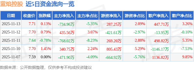 证券之星消息,截至2025年11月13日收盘,蓝焰控股(000968)报收于7.71元,上涨0.13%,换手率1.85%,成交量17.93万手,成交额1.37亿元。