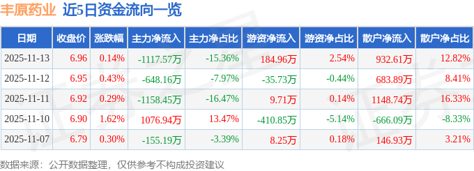 证券之星消息,截至2025年11月13日收盘,丰原药业(000153)报收于6.96元,上涨0.14%,换手率2.28%,成交量10.51万手,成交额7274.63万元。
