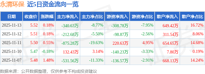 证券之星消息,截至2025年11月13日收盘,永清环保(300187)报收于5.52元,上涨0.18%,换手率1.1%,成交量7.06万手,成交额3884.14万元。