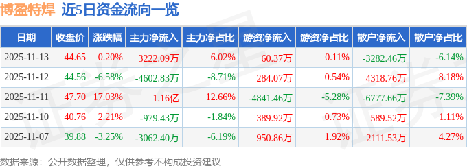 证券之星消息,截至2025年11月13日收盘,博盈特焊(301468)报收于44.65元,上涨0.2%,换手率16.1%,成交量12.08万手,成交额5.35亿元。