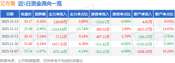 证券之星消息,截至2025年11月13日收盘,艾布鲁(301259)报收于35.17元,上涨0.26%,换手率4.0%,成交量3.96万手,成交额1.4亿元。