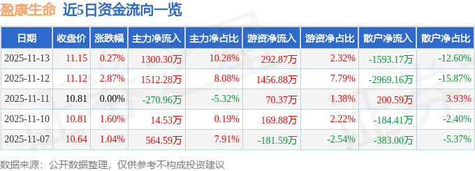 证券之星消息,截至2025年11月13日收盘,盈康生命(300143)报收于11.15元,上涨0.27%,换手率1.79%,成交量11.46万手,成交额1.26亿元。
