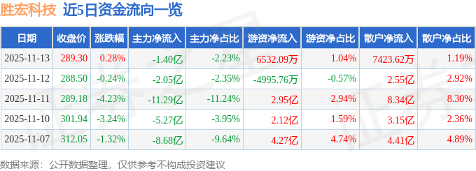 证券之星消息,截至2025年11月13日收盘,胜宏科技(300476)报收于289.3元,上涨0.28%,换手率2.55%,成交量21.79万手,成交额62.54亿元。