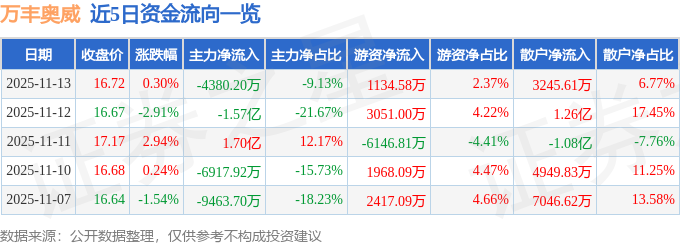 证券之星消息,截至2025年11月13日收盘,万丰奥威(002085)报收于16.72元,上涨0.3%,换手率1.35%,成交量28.75万手,成交额4.8亿元。