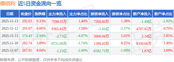 证券之星消息,截至2025年11月13日收盘,德明利(001309)报收于292.03元,上涨0.33%,换手率11.07%,成交量17.8万手,成交额52.6亿元。