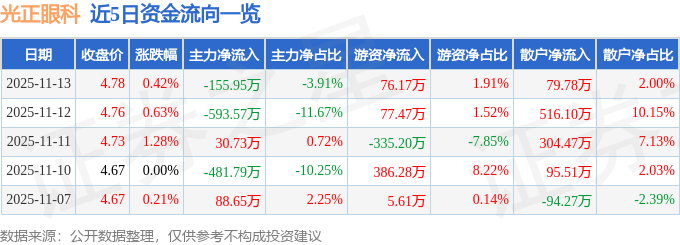 证券之星消息,截至2025年11月13日收盘,光正眼科(002524)报收于4.78元,上涨0.42%,换手率1.65%,成交量8.4万手,成交额3983.66万元。