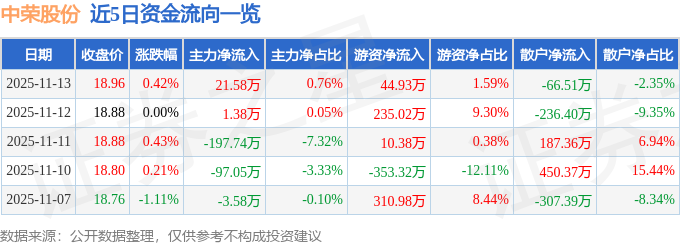 证券之星消息,截至2025年11月13日收盘,中荣股份(301223)报收于18.96元,上涨0.42%,换手率1.33%,成交量1.5万手,成交额2825.89万元。