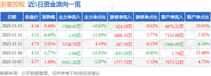 证券之星消息,截至2025年11月13日收盘,浙富控股(002266)报收于4.54元,上涨0.44%,换手率3.08%,成交量150.79万手,成交额6.87亿元。