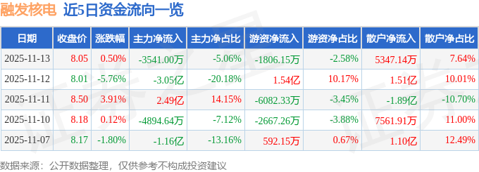 证券之星消息,截至2025年11月13日收盘,融发核电(002366)报收于8.05元,上涨0.5%,换手率6.99%,成交量87.89万手,成交额7.0亿元。