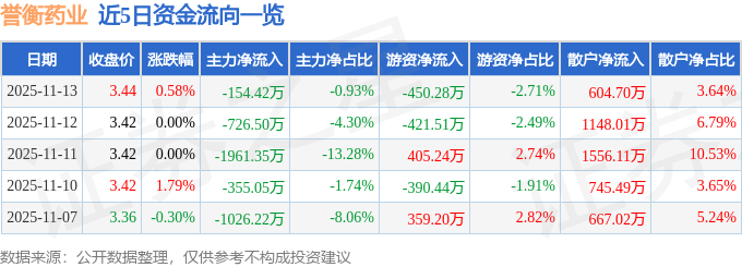 证券之星消息,截至2025年11月13日收盘,誉衡药业(002437)报收于3.44元,上涨0.58%,换手率2.31%,成交量48.57万手,成交额1.66亿元。
