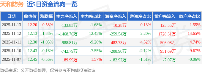 11月13日的资金流向数据方面,主力资金净流出133.83万元,占总成交额1.68%,游资资金净流入10.28万元,占总成交额0.13%,散户资金净流入123.55万元,占总成交额1.55%。