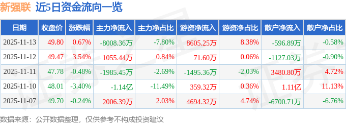 证券之星消息,截至2025年11月13日收盘,新强联(300850)报收于49.8元,上涨0.67%,换手率6.92%,成交量20.81万手,成交额10.27亿元。
