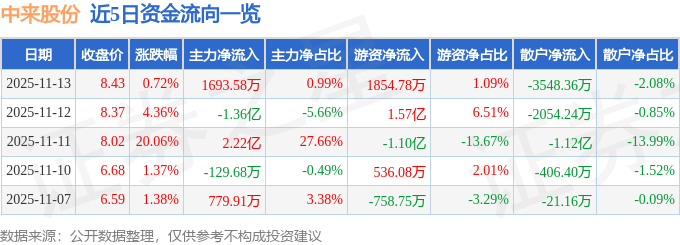 证券之星消息,截至2025年11月13日收盘,中来股份(300393)报收于8.43元,上涨0.72%,换手率21.31%,成交量203.7万手,成交额17.06亿元。