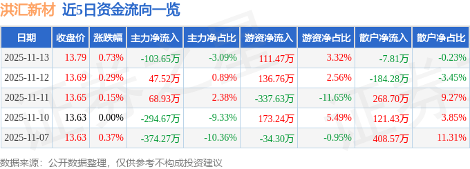 证券之星消息,截至2025年11月13日收盘,洪汇新材(002802)报收于13.79元,上涨0.73%,换手率1.34%,成交量2.44万手,成交额3354.31万元。