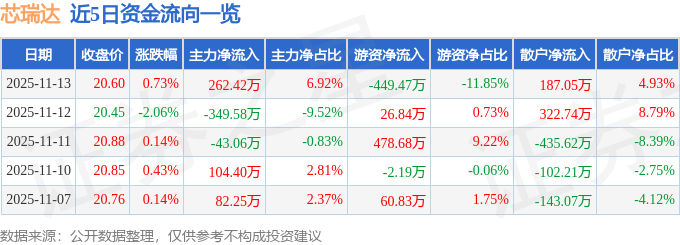 证券之星消息,截至2025年11月13日收盘,芯瑞达(002983)报收于20.6元,上涨0.73%,换手率1.44%,成交量1.85万手,成交额3792.66万元。