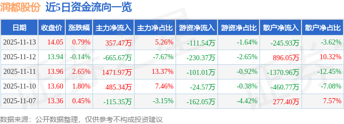 证券之星消息,截至2025年11月13日收盘,润都股份(002923)报收于14.05元,上涨0.79%,换手率1.88%,成交量4.86万手,成交额6794.65万元。