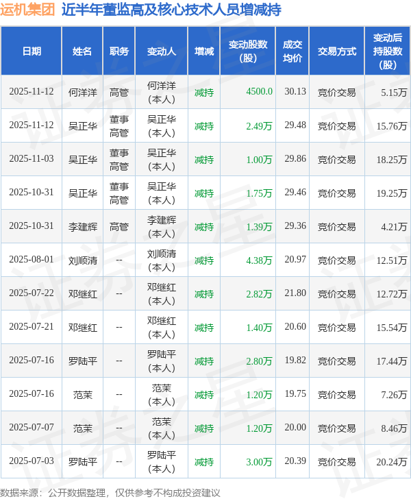 运机集团近半年内的董监高及核心技术人员增减持详情如下: