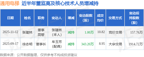 证券之星消息,根据11月13日市场公开信息、上市公司公告及交易所披露数据整理,通用电梯(300931)最新董监高及相关人员股份变动情况:2025年11月12日公司董事,高管张建林共减持公司股份1.0万股,占公司总股本为0.0042%。变动期间公司股价下跌0.82%,11月12日当日收盘报10.84元。