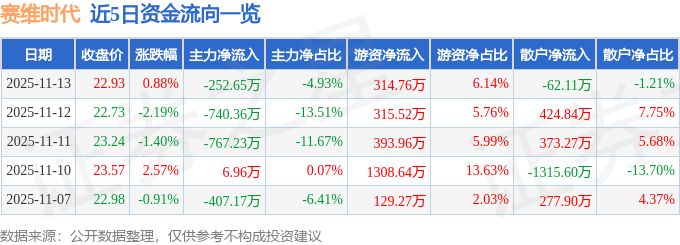 证券之星消息,截至2025年11月13日收盘,赛维时代(301381)报收于22.93元,上涨0.88%,换手率1.16%,成交量2.26万手,成交额5126.46万元。