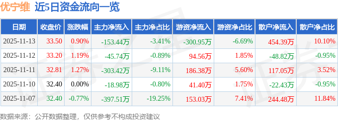 证券之星消息,截至2025年11月13日收盘,优宁维(301166)报收于33.5元,上涨0.9%,换手率2.37%,成交量1.35万手,成交额4497.15万元。
