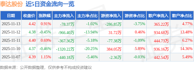 证券之星消息,截至2025年11月13日收盘,泰达股份(000652)报收于4.42元,上涨0.91%,换手率1.18%,成交量17.37万手,成交额7649.69万元。