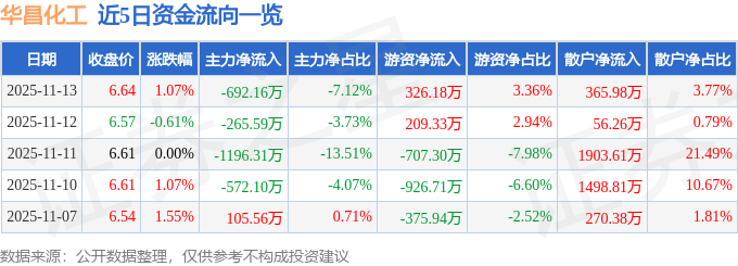 证券之星消息,截至2025年11月13日收盘,华昌化工(002274)报收于6.64元,上涨1.07%,换手率1.56%,成交量14.67万手,成交额9718.66万元。