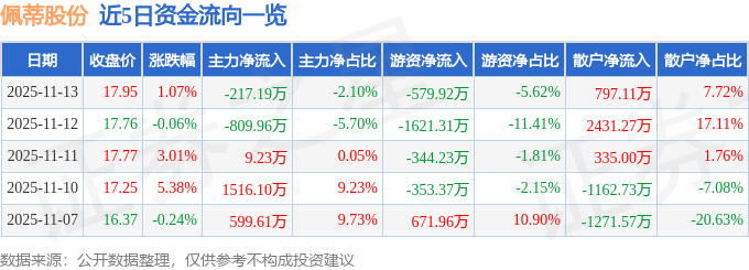 证券之星消息,截至2025年11月13日收盘,佩蒂股份(300673)报收于17.95元,上涨1.07%,换手率3.6%,成交量5.83万手,成交额1.03亿元。