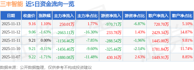 证券之星消息,截至2025年11月13日收盘,三丰智能(300276)报收于9.16元,上涨1.1%,换手率1.47%,成交量15.52万手,成交额1.41亿元。