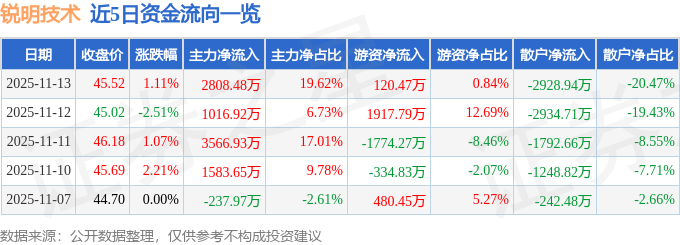证券之星消息,截至2025年11月13日收盘,锐明技术(002970)报收于45.52元,上涨1.11%,换手率2.57%,成交量3.17万手,成交额1.43亿元。