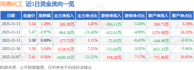 证券之星消息,截至2025年11月13日收盘,同德化工(002360)报收于5.54元,上涨1.28%,换手率4.01%,成交量13.14万手,成交额7265.74万元。
