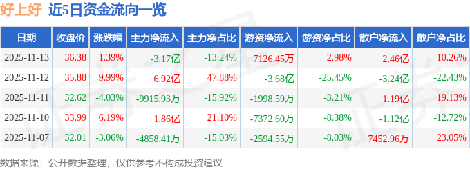 证券之星消息,截至2025年11月13日收盘,好上好(001298)报收于36.38元,上涨1.39%,换手率39.21%,成交量64.57万手,成交额23.94亿元。