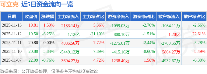 11月13日的资金流向数据方面,主力资金净流入2183.14万元,占总成交额5.36%,游资资金净流出1099.03万元,占总成交额2.7%,散户资金净流出1084.11万元,占总成交额2.66%。