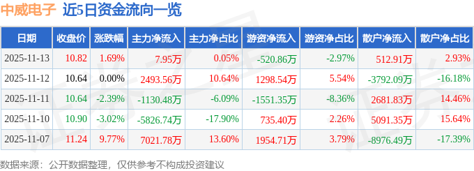 证券之星消息,截至2025年11月13日收盘,中威电子(300270)报收于10.82元,上涨1.69%,换手率6.28%,成交量16.39万手,成交额1.75亿元。