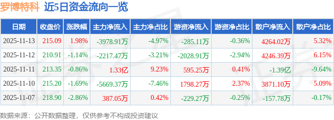 证券之星消息,截至2025年11月13日收盘,罗博特科(300757)报收于215.09元,上涨1.98%,换手率2.54%,成交量3.76万手,成交额8.01亿元。