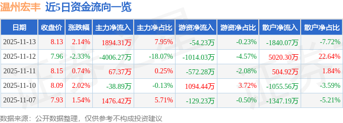 证券之星消息,截至2025年11月13日收盘,温州宏丰(300283)报收于8.13元,上涨2.14%,换手率8.0%,成交量29.39万手,成交额2.38亿元。