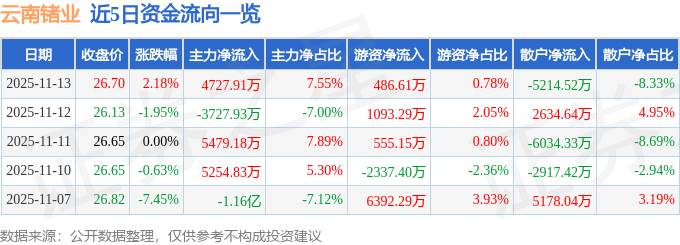 证券之星消息,截至2025年11月13日收盘,云南锗业(002428)报收于26.7元,上涨2.18%,换手率3.61%,成交量23.56万手,成交额6.26亿元。