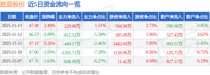 证券之星消息,截至2025年11月13日收盘,胜蓝股份(300843)报收于47.38元,上涨2.49%,换手率2.78%,成交量4.37万手,成交额2.05亿元。