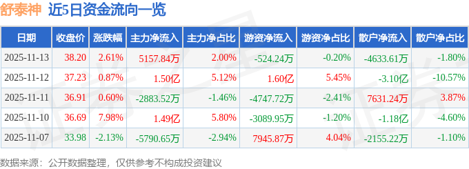 证券之星消息,截至2025年11月13日收盘,舒泰神(300204)报收于38.2元,上涨2.61%,换手率15.12%,成交量68.58万手,成交额25.76亿元。