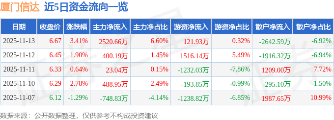 证券之星消息,截至2025年11月13日收盘,厦门信达(000701)报收于6.67元,上涨3.41%,换手率8.61%,成交量57.47万手,成交额3.82亿元。