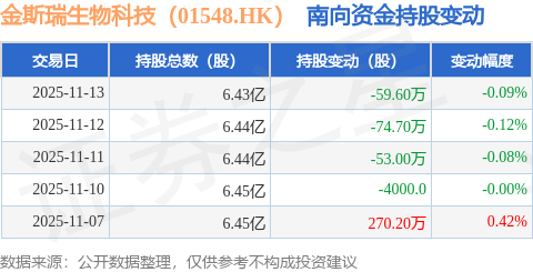 证券之星消息,11月13日南向资金减持59.6万股金斯瑞生物科技(01548.HK)。近5个交易日中,获南向资金增持的有1天,累计净增持82.5万股。近20个交易日中,获南向资金减持的有13天,累计净减持509.12万股。截至目前,南向资金持有金斯瑞生物科技(01548.HK)6.43亿股,占公司已发行普通股的29.41%。
