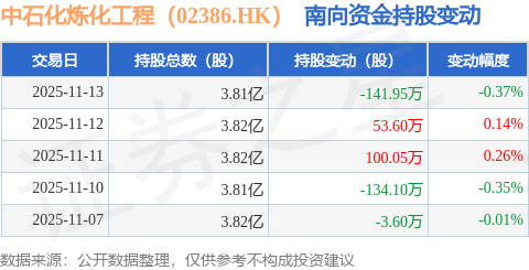 证券之星消息,11月13日南向资金减持141.95万股中石化炼化工程(02386.HK)。近5个交易日中,获南向资金减持的有3天,累计净减持126.0万股。近20个交易日中,获南向资金增持的有11天,累计净增持289.1万股。截至目前,南向资金持有中石化炼化工程(02386.HK)3.81亿股,占公司已发行普通股的26.7%。