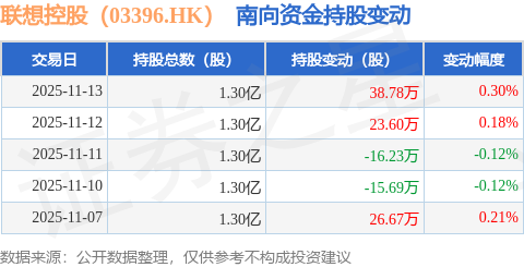证券之星消息,11月13日南向资金增持38.78万股联想控股(03396.HK)。近5个交易日中,获南向资金增持的有3天,累计净增持57.13万股。近20个交易日中,获南向资金增持的有14天,累计净增持311.73万股。截至目前,南向资金持有联想控股(03396.HK)1.3亿股,占公司已发行普通股的10.24%。