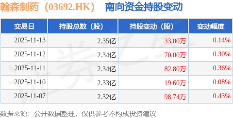 证券之星消息,11月13日南向资金增持33.0万股翰森制药(03692.HK)。近5个交易日中,获南向资金增持的有5天,累计净增持304.14万股。近20个交易日中,获南向资金增持的有14天,累计净增持691.84万股。截至目前,南向资金持有翰森制药(03692.HK)2.35亿股,占公司已发行普通股的3.86%。