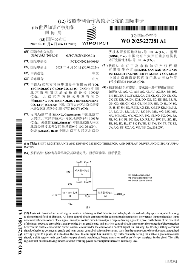 证券之星消息,根据企查查数据显示京东方A(000725)公布了一项国际专利申请,专利名为“移位寄存器单元及其驱动方法、显示驱动器、显示装置”,专利申请号为PCT/CN2024/090965,国际公布日为2025年11月6日。