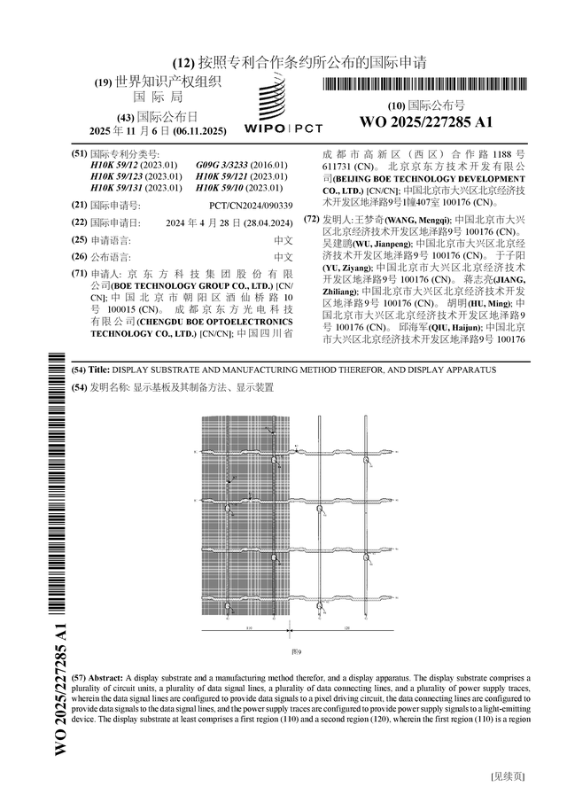 证券之星消息,根据企查查数据显示京东方A(000725)公布了一项国际专利申请,专利名为“显示基板及其制备方法、显示装置”,专利申请号为PCT/CN2024/090339,国际公布日为2025年11月6日。